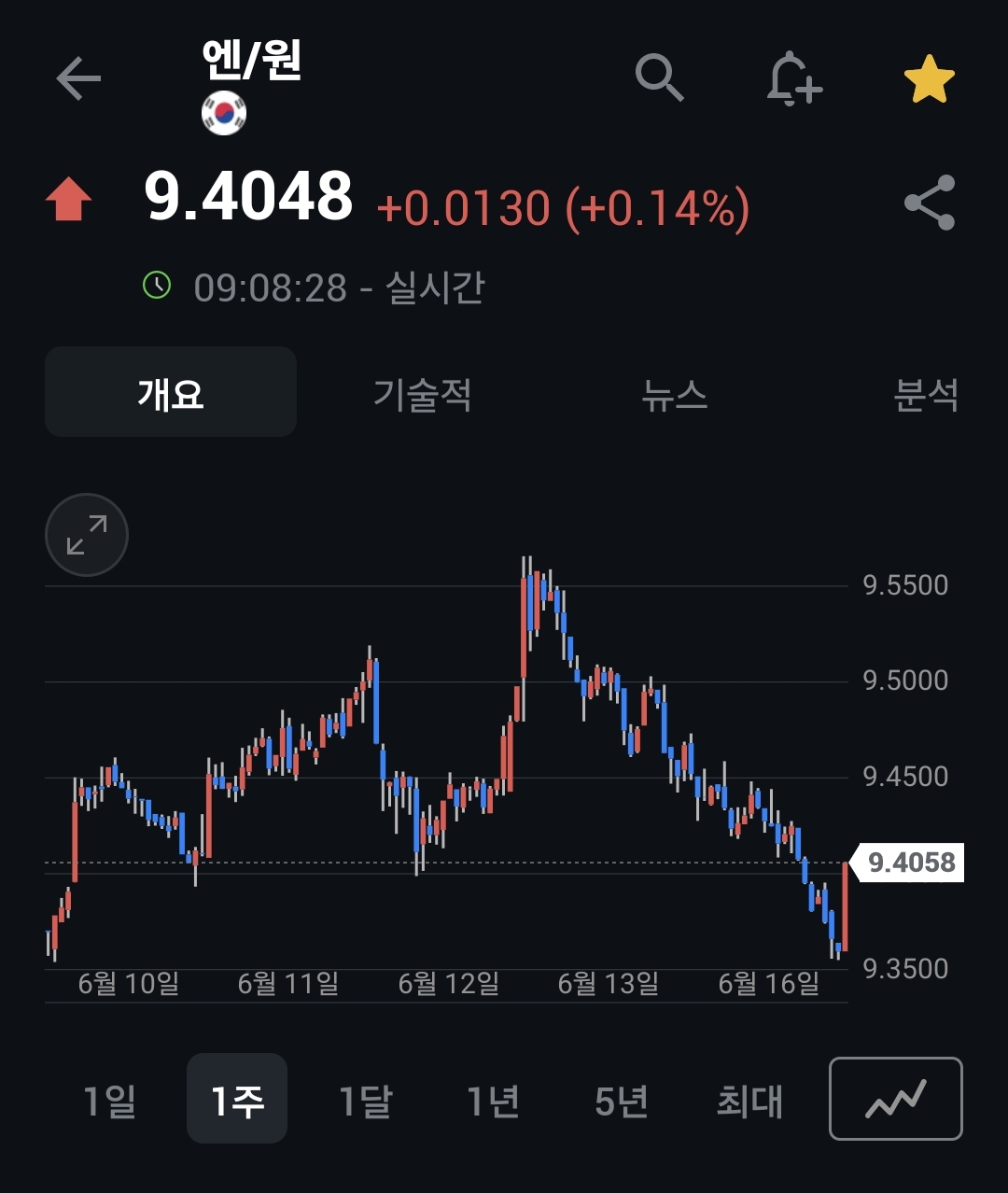 6월 16일 기준 주요 시장조사기관 Wise 기준 1 JPY ≈ 9.36원, 전일 기준 9.3599원 .