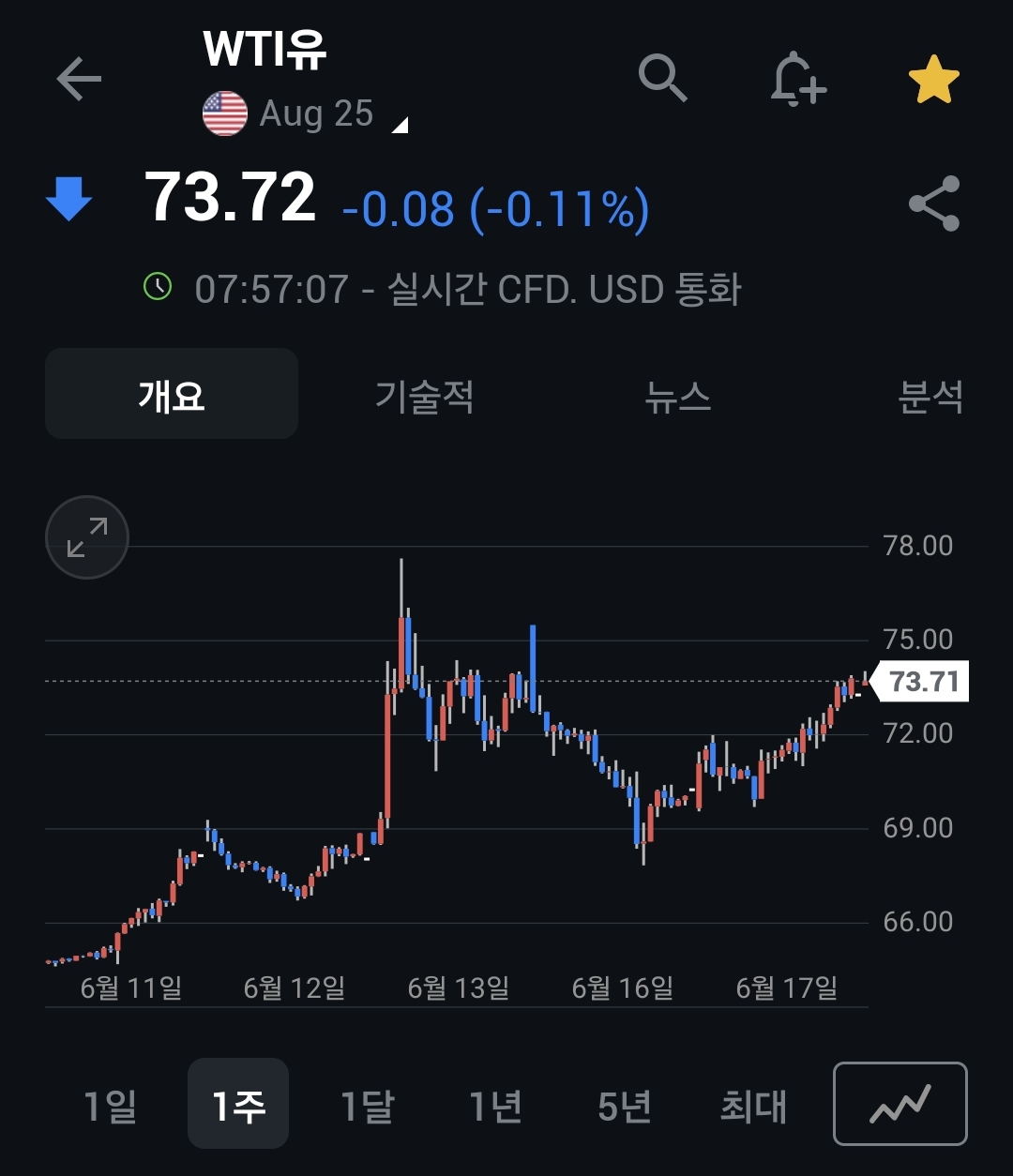 WTI 선물가격은 오늘 배럴당 약 73.2 USD로, 2% 가까이 상승했습니다 . 최근 미국과 이란 간 지정학적 긴장 고조, 그리고 통상 리스크와 달러 약세 심리가 중첩되며 유가가 상승 압력을 받는 중입니다 .